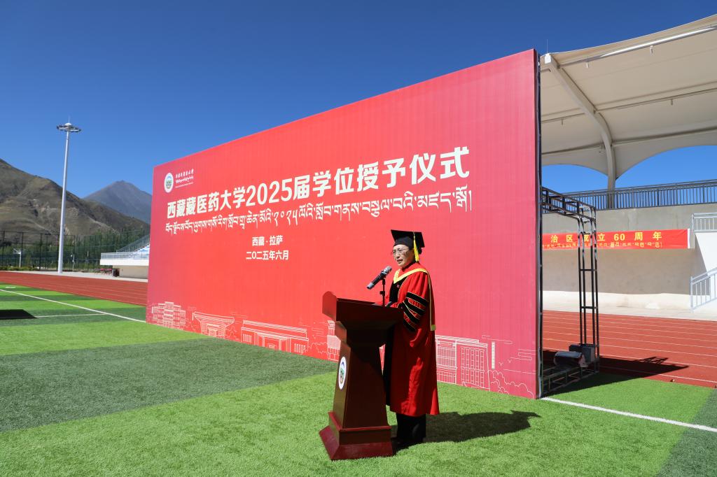 米玛强调,身处新时代的广大毕业生,仍需要重塑学习的意义和方法,在日新月异的变革中把握好未来之“路”。希望同学们一要筑牢信仰之基,厚植家国情怀。把家国作为奋斗、奉献的基础,把个人理想融入国家和民族的伟大梦想之中,在时代的浪潮中锚定方向,将理想信念熔铸于青春热血,把爱国情怀镌刻在藏医药传承创新的奋进道路上。二要跟随先贤足迹,走好传承之路。在浩瀚的藏医药典籍中寻根溯源,从藏医药理论与实践中汲取智慧与力量,将个人前途与藏医药发展紧密融合,为人民群众的生命健康保驾护航,以一颗敬畏之心,精心守护这份文明的根脉。三要紧跟时代步伐,驰骋创新之路。秉承先贤“敢为人先”的探索精神,敏锐洞察领域前沿,勇于跨越学科界限,在临床实践与科学研究中不断提出新见解、尝试新路径、贡献新智慧,在问题的深度求解和不断创新中推动藏医药行业发展、实现自我价值。
