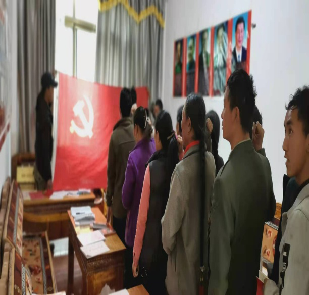 首先,组织全体党员集体唱国歌。在庄严神圣的国歌后,由党支部书记次央同志带领大家重温入党誓词,使每名党员深深感受到使命和责任。