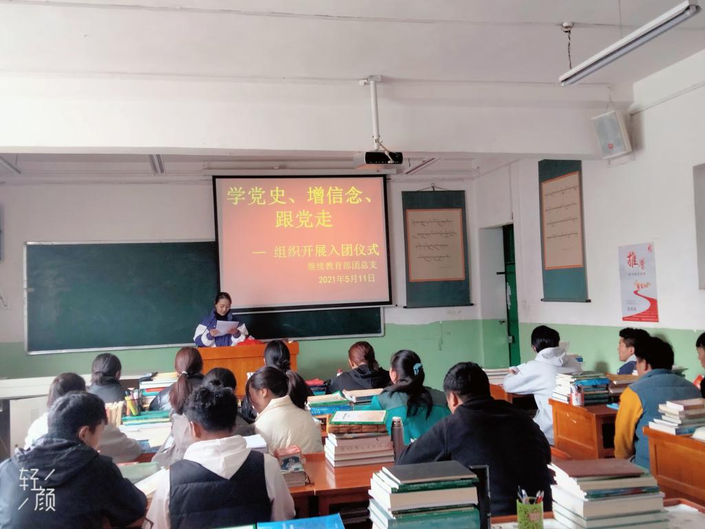 为喜迎中国共产党成立 100 周年,西藏和平解放 70 周年,结合全团正在开展的“学党史 强信念 跟党走”学习教育活动, 继续教育部团总支于5月11日在多媒体教室按照规定组织开展入团仪式,18名新团员及团团代表参加了入团仪式,仪式由团总支书记金珠措姆主持。