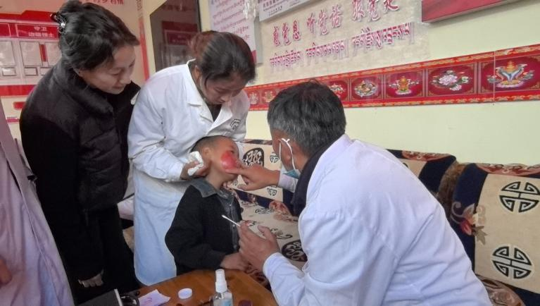 雪雄玛村一名6岁的小男孩,叫达娃久美,患有一种皮肤病,长在脸上,瘙痒且容易感染。28日下午,在家长带领下来求诊。专家对其现场处理,先做专业清洗,,然后涂抹了药膏,并叮嘱家长说,多涂抹几次就会好的。29日下午,小男孩的家长发照片过来,脸上患处明显好转。