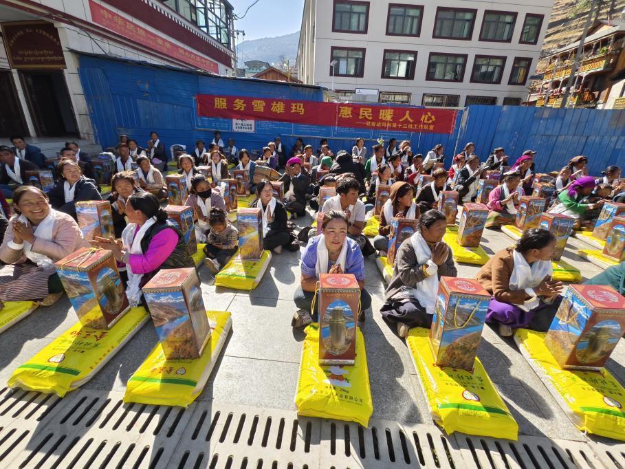 下午,村民们得到通知就早早地来到广场,在村两委班子成员的组织下,自觉排起长长的队伍,有序领取惠民物资。每户领取了1个藏式暖水瓶和1袋大米。